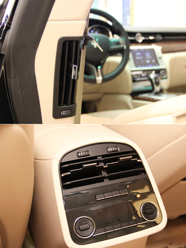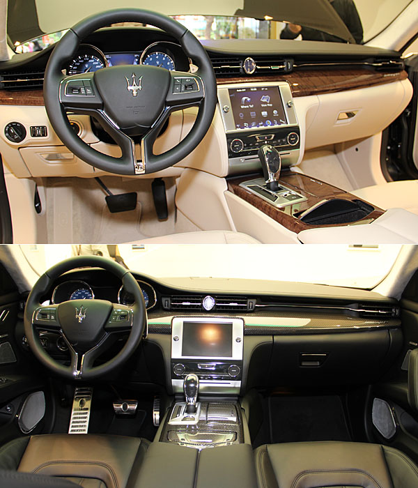 車室內裝透過整合車內各項功能於8.4吋的Maserati TOUCH PANEL螢幕所賜,讓整體造型簡潔流暢,沒有過於繁複的疑慮。一如往常,在Quattroporte GTS上依然保有高度客製化服務,上圖為米色內裝搭配木紋飾板,下圖就為黑色內裝搭配碳纖維飾板材質,營造出奢華或熱血的不同駕駛氛圍。