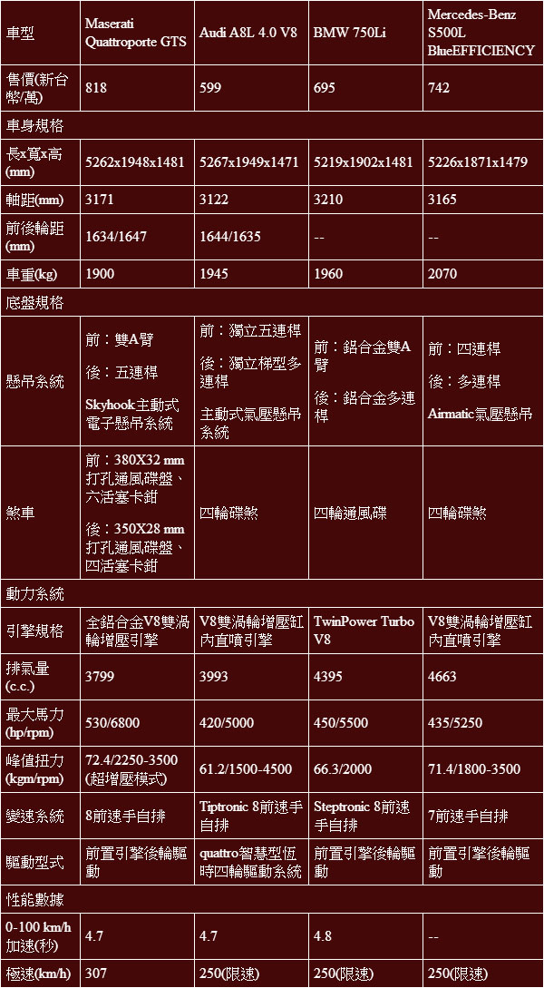 Maserati Quattroporte GTS與目標對手基本規格表