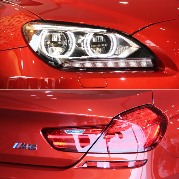 以BMW 6系列Gran Coupe的美學外型為基礎,加上外擴輪拱、前方大型進氣壩與立體側裙設計雕塑出全新M6 Gran Coupe強勁的肌肉線條,四門五座的設定讓全新M6 Gran Coupe在展現純正跑格血統的同時,提供駕乘者絕佳的實用便利性。採用長軸距、短前懸的設計,引擎蓋上的V型曲線延伸至前方M款黑色雙腎型水箱護罩處,與LED主動式轉向頭燈連成一氣。若從車尾看去,全新M6 Gran Coupe的L型LED尾燈提升了夜間行駛的辨識度,而位於車尾下裙襬的碳纖維分流器能將底盤間的氣流平整化。專屬於BMW M的M款腮狀飾板、雙邊四出排氣尾管、M款車外後視鏡、M款雙輻式20吋輪圈、與M款後擾流翼打造出經典的M式戰袍,而輕量化的碳纖維車頂不僅能降低車身重心,特殊設計的中央凹槽則能同時提升空氣力學與操控快感。