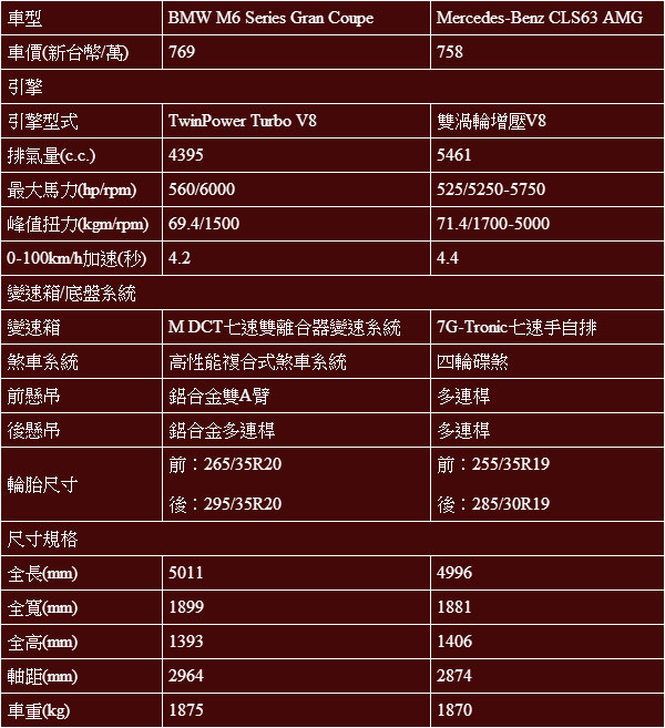 BMW M6 Gran Coupe與競爭對手基本規格表