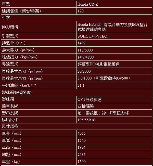2010年問世,並且在2011年引進台灣的CR-Z,是Honda結合以往CRX系列的操駕樂趣,以及節能複合動力之特色所創造新世代輕跑車,全新發表的小改款CR-Z,跑車外型更顯俐落,動力操控進化升級,並且以更具魅力售價,提升整體吸引力,提供消費者更輕鬆擁有複合動力跑車的機會。