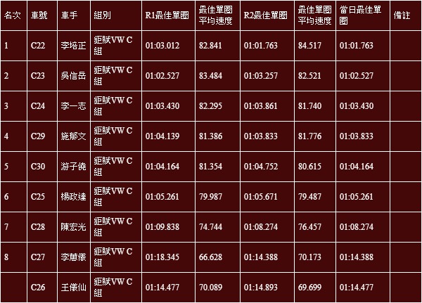 成績部分,駕駛Tiguan的李培正於下午做出1:01.763的成績名列鉅賦VW C組第1。做出第二快時間的吳信岳同樣駕駛Tiguan,成績為1:02.527,聯手以兩輛SUV盤據鉅賦VW C組的首兩位。兄弟檔車手李一統與李一志中的李一志,則是駕駛Passat Variant做出1:03.430的成績,名列鉅賦VW C組第3。