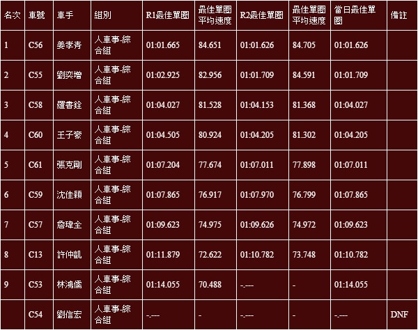 在時間表現上,儘管多數車齡超過10年,但表現也毫不遜色,做出1:01.626最快成績的姜孝青便是駕駛Honda Civic K6。排名第2的劉亦增所駕駛的也是一輛照顧的車況良好的BMW E36 318ti,做出1:01.709的成績。駕駛Citroën Saxo的羅書銓,則是以1:04.027的表現位居綜合組第3。