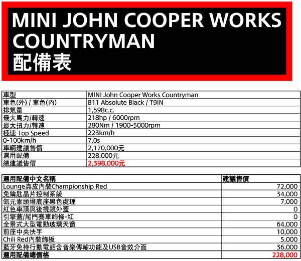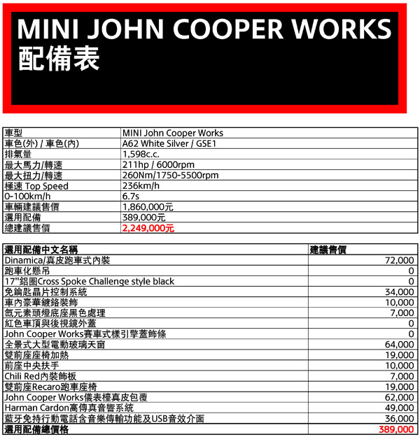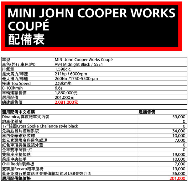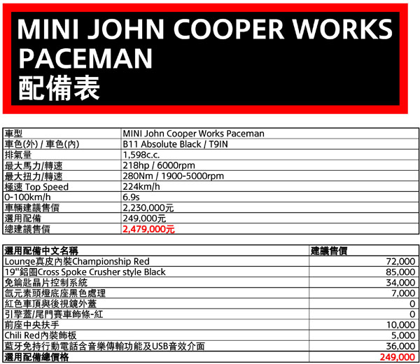 為了發揚光大Mini引以為傲的操控樂趣,在Mini總代理汎德積極向原廠爭取下,將於6月上旬正式引進Mini旗下賽車品牌John Cooper Works,一舉推出共4款全新John Cooper Works車型,更在全球供不應求的情況下,爭取到John Cooper Works共100輛的配額,包含Mini John Cooper Works (30台)、Mini John Cooper Works Coupe (20台)、Mini John Cooper Works Countryman (30台)與Mini John Cooper Works Paceman (20台),各車型預售價為Mini John Cooper Works:186萬元、Mini John Cooper Works Coupe:188萬元、Mini John Cooper Works Countryman:217萬元與Mini John Cooper Works Paceman:223萬元,提供國內鋼砲級車主競技感十足的熱血選擇!