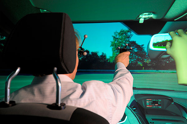 這套3D虛擬實境技術,透過眼睛、還有手把上猶如觸角一般的感應端子,以及房間內的紅外線動作感應偵測系統,去偵測頭部的轉動與上下擺動,決定畫面的呈現,進而模擬出猶如現實生活一般的情境。同時,手把的移動,也可模擬手部的運動,進而進行車門開關、方向盤移動、調整後視鏡等不同的動作,就好像真的身處於車室之中一般。
