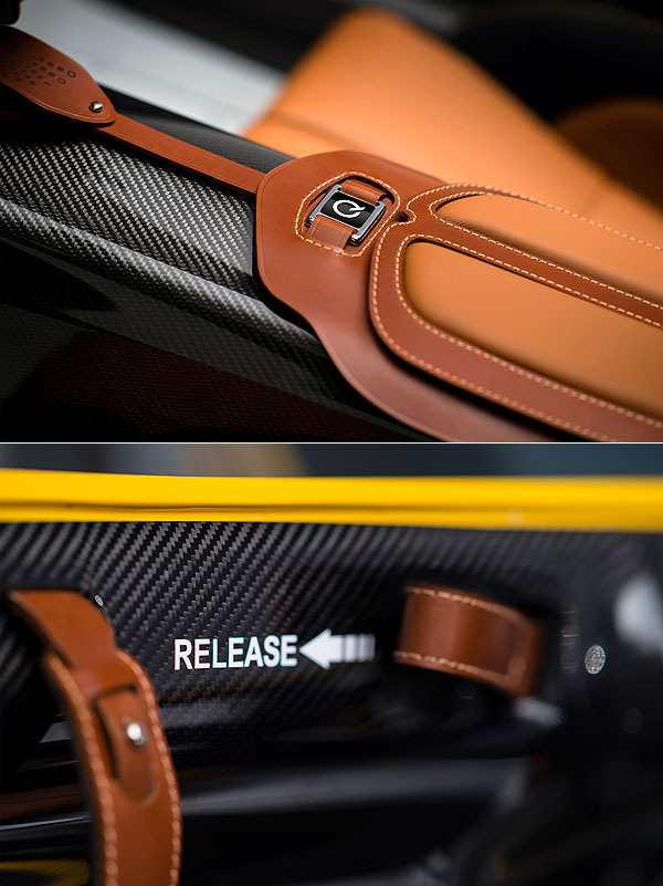 與其說這沿襲Aston Martin天鵝展翼式開啟方式的短小門板為車門,不如說是可動式的仿滾籠架較為貼切。
