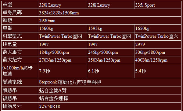 動力系統,全新320i 與328i Gran Turismo採用BMW TwinPower Turbo直列四缸引擎,成就全新320i Gran Turismo最大184hp德制馬力,在1250的低轉速時產生270Nm的豐沛輸出,達到從0至100km/h僅需7.6秒;而全新328i Gran Turismo則擁有最大245hp德制馬力、在1250的低轉速時提供350Nm的大扭力、自靜止加速至100km/h僅需6.1秒。