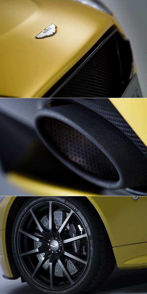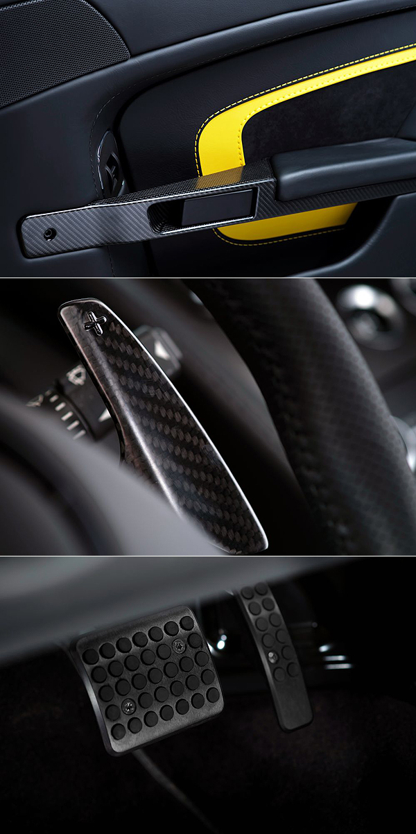 車室內裝則導入新式樣的運動化座椅,運用真皮與Alcantara麂皮混搭,並且運用對比強烈的皮革與縫線設計,搭配碳纖維飾板與碳纖維換檔撥片,以及運動化的小型黑色踏板組,帶來運動風格濃烈的車室氛圍。同時,Aston Martin還提供碳纖維輕量化座椅,以及碳纖維內裝套件,將儀表板、與車門把手等處換上碳纖維嵌件,帶來更具熱血氛圍的座艙氛圍。
