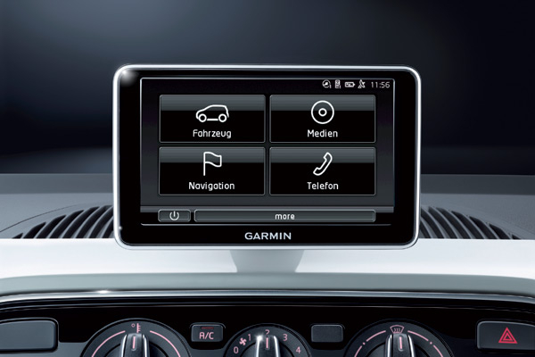 此外,up!車上所搭載的「maps and more」導航系統也更加新穎:新的系統支援智慧型手機的上網功能,同時能獲取即時資訊的服務,包括當前的路徑顯示、以及到達目的地所剩距離,另外還有未來兩天的氣象資訊預覽、還有所處地點的資訊搜尋功能、與即時交通資訊等等,同時還能提供理想路線的建議等等;此maps and more系統的選配價格則為390歐元(約1.5萬元)。