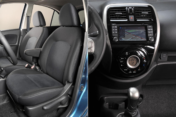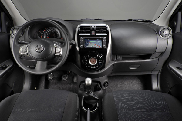 內裝部份,小改款Micra擁有全新的中控台設計、中央出風口也擁有全新的造形,另外駕駛座儀表的顯示圖像也經過改良;細節方面,中控面板採用全新高光澤黑色烤漆飾板,而中控飾板外環、排檔頭、與排檔座外環等,則施以霧面金屬色裝飾。座椅、與車門內飾部份,小改款Micra採用了全新的織布材質,Vista與Acenta配備等級車型搭配著經編網格機織織布,而頂級配備的Tekna車型,則配備仿麂皮的織布材質,同時內裝更採用雙層的車縫線縫製。