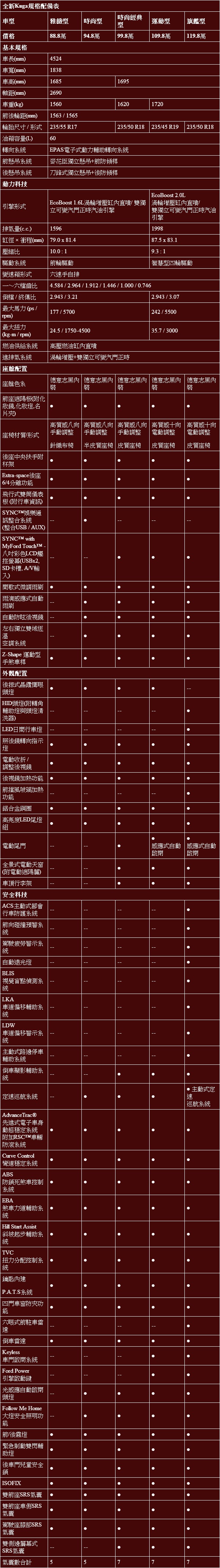 Ford全新Kuga規格配備表