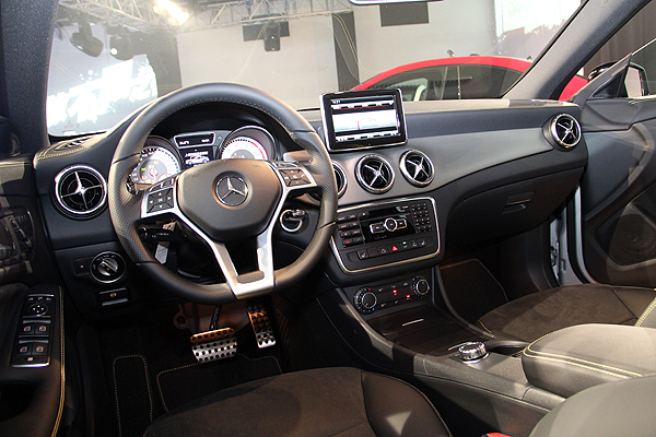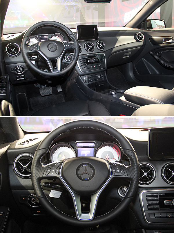 鎖定年輕消費族群的CLA,車室內裝的鋪陳與A-Class以及B-Class相當類似,噴射機燃氣渦輪發動機狀的空調出風口,以及中央獨立式的液晶螢幕與雙層式的中控台設計,是相同的元素,也是座艙設計的基礎。搭配3輻式真皮多功能方向盤、配有紅色指針與方格旗表面的雙筒型儀表板,以及冷冽的金屬元素點綴,為CLA的座艙提供活潑且不失質感的氛圍。