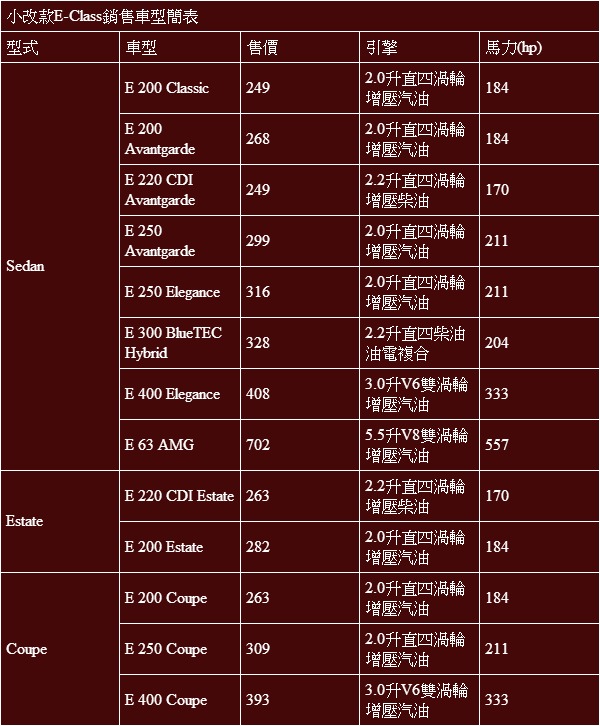 旅行車則引進汽、柴油各一種車型,分別為E 220 CDI Estate與E 200 Estate。