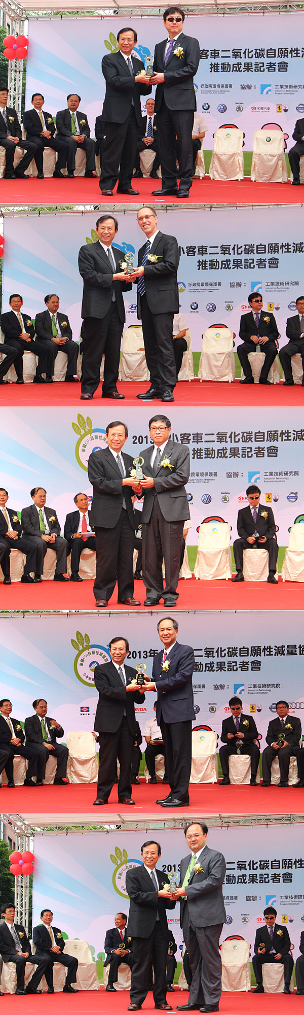 環保署特地選在6月11日當天舉辦記者會頒獎表揚,包含提前達成目標的汎德(BMW)、台灣賓士(Mercedes-Benz)、福特六和(Ford)、和泰汽車(Toyota/Lexus)與利奔汽車(Skoda)等(由上至下)。