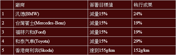 此協議乃是針對原廠提供之碳排放數據與經濟部能源局所測試之油耗數據進行評估,也因此提前於2015年前達成此協議的五間車廠,其中和泰汽車透過有著優異油耗與低排放表現的油電複合動力車型,使得其低碳車輛(二氧化碳排放≦120g/km)銷售比例已達總數的兩成,減碳成果顯著。
