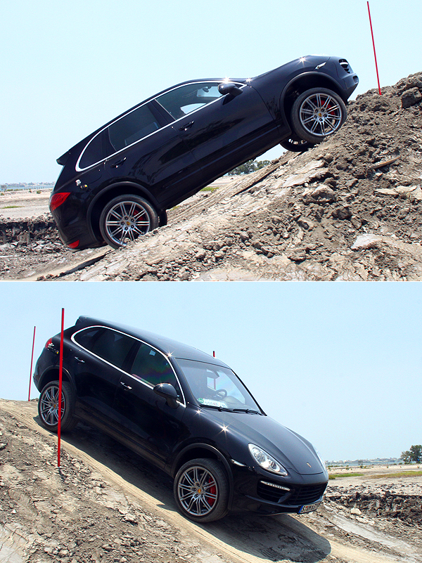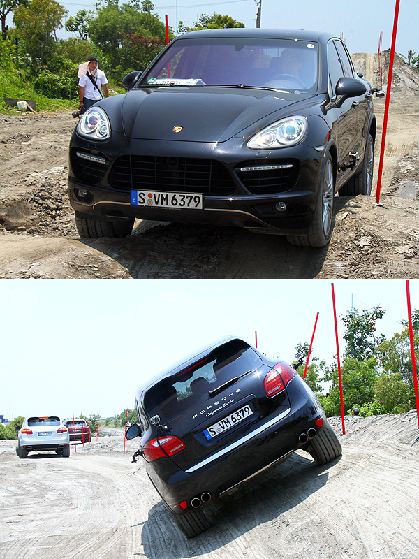 在今年的Porsche World Roadshow活動中,原廠將Cayenne Turbo、Cayenne Turbo S與Cayenne Diesel等車款空運來臺,並在大鵬灣賽車場附近的灘地中挖掘一條測試道,包含坑洞、陡坡、側傾坡道等關卡,同時鬆軟的灘地土質,也能感受Cayenne在惡劣環境中的表現。只要依循教練指示,確定行車模式處於越野模式、並將氣壓式懸吊設定在最高一段,提高Cayenne的進入角與離去角,透過PTM保時捷循跡管理系統監控車輪抓地狀況,並適當分配各輪扭力,Cayenne便能在惡劣的地形中來去自如。