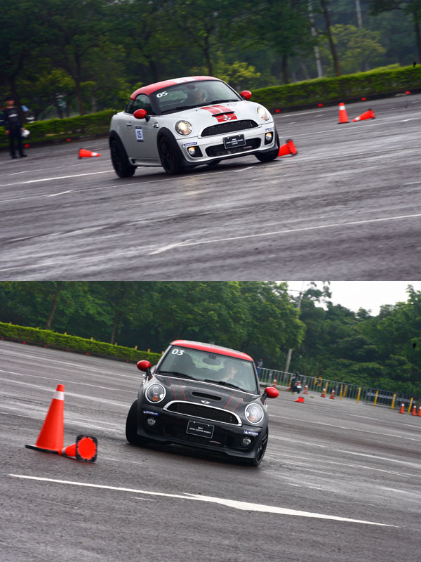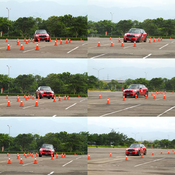 接下來動態駕訓活動中第一站為「車道變換訓練」,試駕車款為配備ALL4全時四輪驅動系統的Mini John Cooper Works Paceman,展現Mini在高速行駛中對緊急情況的精準應變能力,在此關卡中,駕駛者分別有三次機會,須以時速60km/h、70km/h與70km/h+關閉DSC動態穩定控制系統三種條件進行高速換道,由於當車輛快速變換車道,造成重心快速轉移下,極容易發生失控,因此,駕駛者必須在最短的時間內掌握車輛動態,但若是配有DSC動態穩定控制系統,該系統若發現車輛即將失控,會強制介入修正車輛動態讓車輛可以恢復到平穩狀態,所以在第三次關閉DSC系統體驗中,就會發現車輛擺動的幅度明顯增加,必須以更細緻的方式控制方向盤,迅速迴避前方狀況,而「車道變換訓練」也是眾多駕訓與動態體驗活動中最常出現的項目,其對於行車安全的重要性可見一斑。