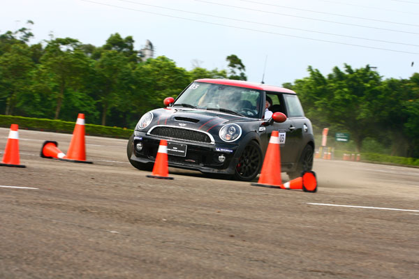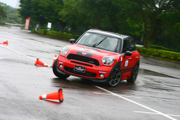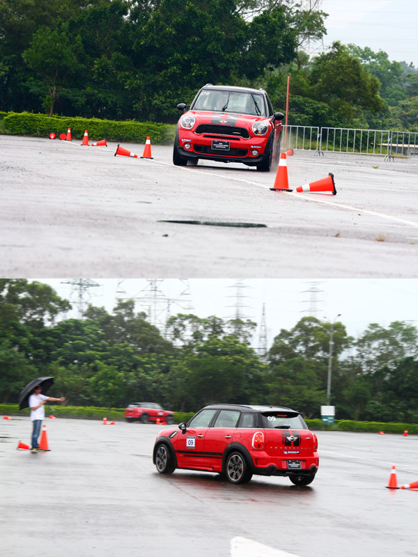 最後第三站則為「繞錐訓練」,試駕車款則為同樣配備有ALL4全時四輪驅動系統的Mini John Cooper Works Countryman,搭載馬力高達218hp的雙渦流渦輪增壓引擎,4人5座大空間設計同時仍保有Mini引以為傲的運動賽車基因。特別的是,在此項目中,安排之場地為所有場地最小的,彎角也最小,同時在場地兩端卻安排了車系中尺碼最大的車款,可見原廠對於Mini John Cooper Works Countryman的靈活度十分有信心,在連續的轉向中,也可以練習轉動方向盤的順暢度與熟練度。
