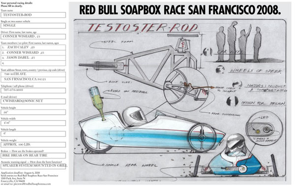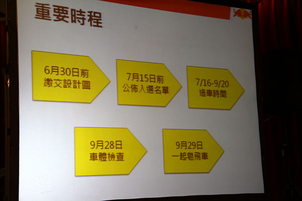 由於賽事只有一天,名額有限,只有最撼動人心、獨具創意的設計才能獲得Red Bull皂飛車大賽專用的駕駛執照。因應民眾熱烈申請洽詢,主辦單位特別於6月底申請期截止前舉辦一皂飛車說明會,邀請去年香港皂飛車大賽冠軍團隊和台灣造車達人前來分享造車經驗,並回應民眾所有對於皂飛車的好奇想像。皂飛車小組也再次提醒有興趣參與此一盛事的民眾,請記得於6月30日前寄回設計藍圖(郵戳為憑)才算完成報名程序,進入接下來的設計徵選階段,歡迎各界創意同好把握機會,呼朋引伴一起尬創意。主辦單位將於7月中公佈入選的50組隊伍,隨後各隊伍將有2個月的時間打造夢想飛車,於9月29日活動當天展現其精心傑作!
