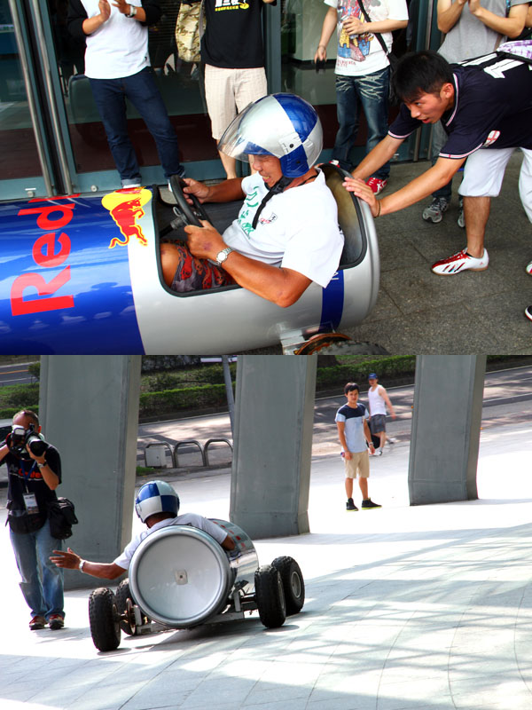 而風靡全球的Red Bull皂飛車大賽將首度決戰台北,屆時來自全台灣最KUSO、最有創意的隊伍將齊聚台北,讓全民也瘋狂,自4月底開放民眾線上申請報名後,目前已有超過600組民眾申請表達參加興趣,主辦單位特別邀請去年香港皂飛車大賽冠軍隊伍來台分享設計和造車經驗,於6月16日在台北小巨蛋舉辦皂車達人說明會,現場吸引數百位申請民眾熱情響應和達人互動機會,並由BMX極限單車選手鄭喬鴻於斜坡示範駕駛無引擎動力的創意皂飛車。所有參賽者,必須把握機會在6/30日前上網申請並寄回設計藍圖,評審團將選出50組最具巧思的團隊點子,入圍參加今年秋天這場獨一無二的創意飛車嘉年華,徹底解FUN台灣人對車的想像,hold住全場目光!