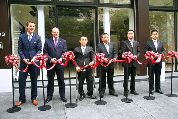 Rolls-Royce全新台中展示中心在〈左起〉Rolls-Royce Motor Cars 亞太區總經理Mr. Dan Balmer、Rolls-Royce Motor Cars 亞太區總裁Mr. Paul Harris、台中市副市長 徐中雄先生、寒舍集團總裁蔡辰威先生、盛惟股份有限公司董事長蔡伯府先生與盛惟股份有限公司總經理蔡伯翰先生共同剪綵後正式開幕!