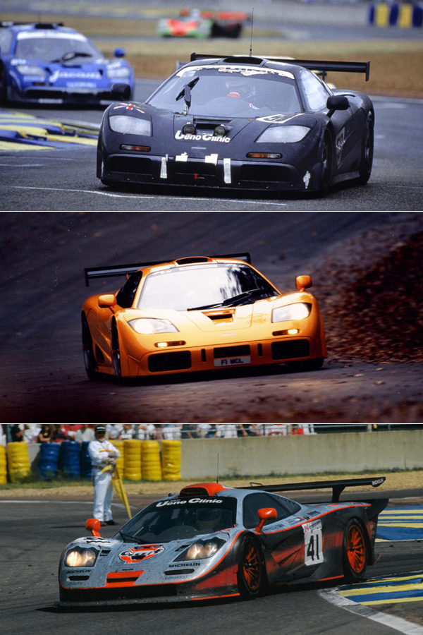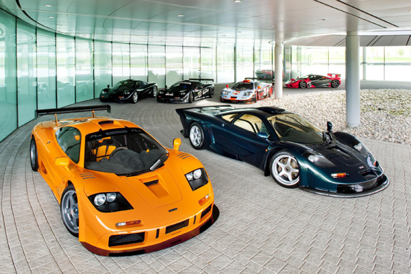 McLaren F1市售車僅生產共71輛,包括F1標準車型(後排左一)的64輛,以及個別限定生產5輛與2輛的McLaren F1 LM(前排左)、與McLaren F1 GT(前排右)。