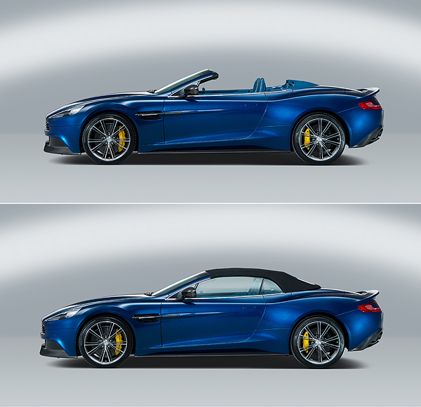 Aston Martin為採用電動軟篷設定的 Vanquish Volante導入由3層複合式輕量化織布與電動摺疊機構所組成的敞篷設計。整合防水外篷、聚酯纖維、降噪橡膠與Thinsulate保溫材料等材料的頂篷,不僅為Vanquish Volante帶來優雅的外表,同時也維繫了車內的質感與乘坐舒適性。同時,透過電動頂篷的幫助,只需要按下中控台的按鈕,便能在14秒將車頂移除,盡情擁抱天空。
