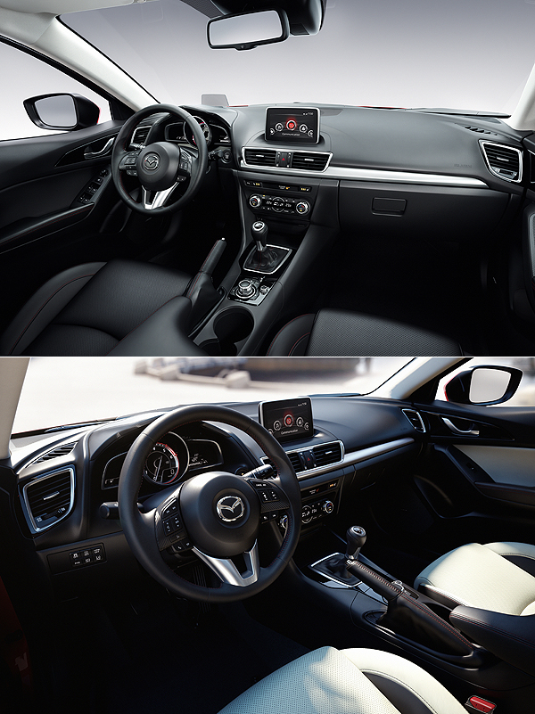 車室內部第3代Mazda3同樣與延續了由CX-5開始的座艙設計,包括方向盤造型,中控台的按鍵配置,都與CX-9以及Mazda6相去不遠。不過強調年輕氣息的Mazda3在儀表板的設計上,採用了單筒式的配置,並將轉速表置於中樣,創造運動感十足的駕駛氛圍。同時導入Mazda新一代的HMI人機介面,能將時速、導航資訊等投射至HUD抬頭顯示器中,讓駕駛能夠將注意力更集中在路況之上。