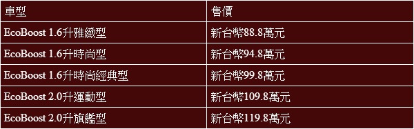 經過多時消息曝光,福特六和終在7月11日於高雄義大世界發表全新Kuga,提供1.6升與2.0升兩渦輪汽油動力車型,並規劃5等級車型,售價介於88.8萬至119.8萬間。