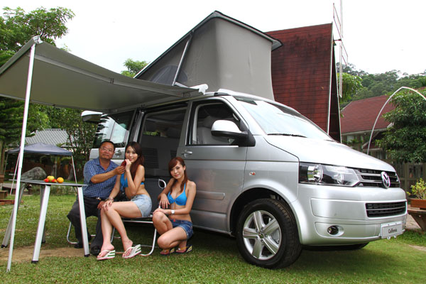 太古標鎰汽車總經理蔡泗銘與兩位模特兒共同展示全新登台的California GP引以為傲的休旅露營機能。
