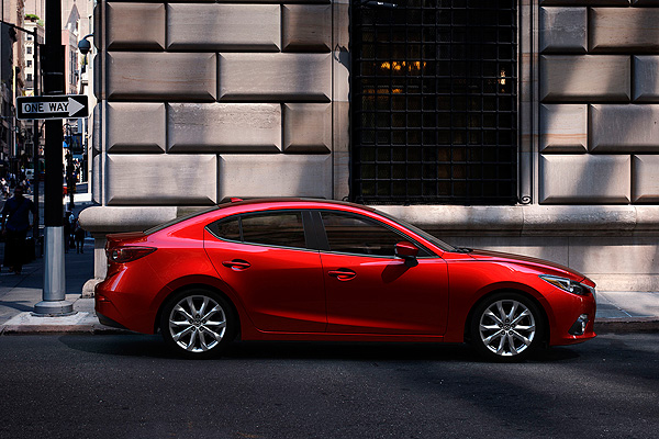 在B柱以前Mazda3 Sedan與Mazda3 Hatch完全雷同,包括車頭水箱護罩的鈑件線條等都相當類似。車側則透過長車頭、短車尾的比例,營造近似於4門Coupe的線條輪廓。
