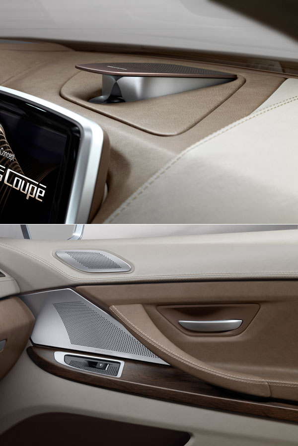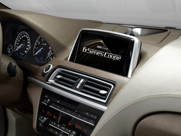 車室內裝方面,除了玻璃車頂的採用外,Concept 6 Series Coupe依舊採用著BMW一貫堅持的駕駛取向鋪陳,並透過材質選用、造形的立體設計,將駕駛座艙與副駕駛空間作一明顯區隔。駕駛座艙中的儀表板,採用著先進的顯示技術,車輛熄火時,所有的顯示數字將全數消失,直待啟動時方會全數亮起,此技術也同樣運用在控台中央音響與空調介面中。
