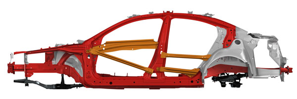 眾所皆知,車體的輕量與否,也與車輛燃油經濟表現息息相關,對此名為SKYACTIV-Body的科技中,透過〝Straight Structure〞與〝Continuous Framework〞等關鍵技術的運用,前者可讓車身框架盡可能的直線化,後者則是透過車身構造的簡化,讓每個結構間的結合更為協調與簡單,避免不必要的焊接點,達倒車身輕量的目的;當然,高強度鋼材的大量運用,也是降低鋼材使用數量、降低車身重量的重點所在。
