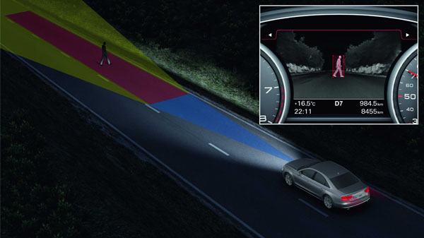 除了多項前驅科技加持之外,全新Audi A8還有另一項安全輔助配備重點,就是Night Vision Assistant夜視輔助系統;Night Vision Assistant夜視輔助系統運用安裝於車頭四環廠徽後的紅外線攝影鏡頭,可偵測路上行人或動物,並在儀表板中央的DIS駕駛資訊系統螢幕顯示;而依照車速的不同,Night Vision Assistant夜視輔助系統最遠偵測距離可達300公尺,且當系統判定有撞擊行人或動物的潛在危機時,DIS螢幕便會閃爍紅色燈光警示駕駛,降低夜間行車的風險。