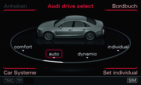 全新A8車款配有Audi Drive Select可程式化車身動態系統,其整合氣壓懸吊、引擎、變速箱和轉向系統,讓駕駛可透過MMI選擇Comfort、Auto或Dynamic三種操駕模式;當然,對於喜愛競技特性的車主,Audi也另外提供選配Individual功能,讓駕駛可依個人需求進行各項更細微的參數調整。