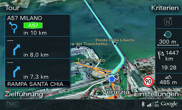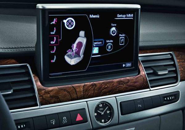 隱藏在中控台內部的8吋MMI多媒體螢幕,在啟動引擎同時會緩速升起,其功能涵蓋基本的影音、通訊以及空調系統外,原廠更加入新一代3D立體影像Navigation Plus衛星導航系統,全面提升頂級旗艦的豪華標準。此外,為了提升科技配備檔次以及兼顧操作便利性,New Audi A8於新一代MMI系統的導航功能中,新增名為「MMI Touch」的觸控面板,駕駛者可透過安排於排檔桿左前方的Touchpad手寫輸入目標地址,加速啟用導航系統的設定過程,不僅摒除層層選單的複雜模式,更不會影響車輛行進間的安全問題。
