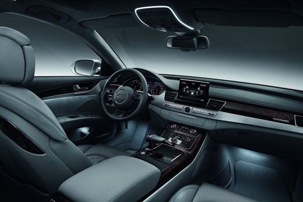 德系頂級豪華旗艦引以為傲的用料質感,在New Audi A8上盡展豪華工藝,皮革觸感細緻,中控台上方之皮料為軟質設計,各按鍵及旋鈕也以霧面鋁合金飾環處理;傳統雙環儀錶的中央配備7吋DIS駕駛資訊顯示系統,其可整合所有行車資訊,讓駕駛在行車過程中也能快速掌控車輛狀況。