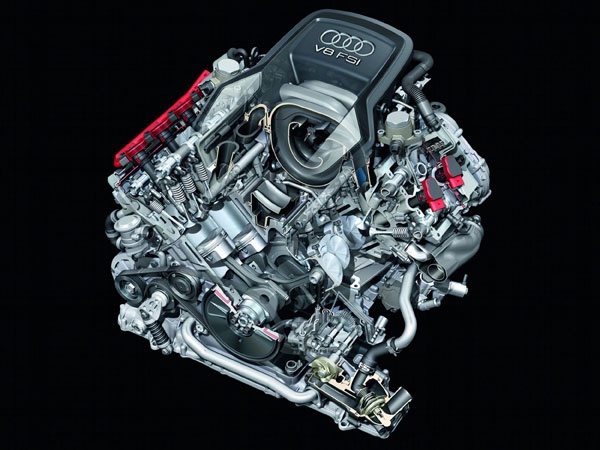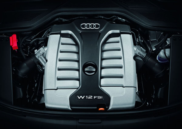6.3升W12 FSI的排氣量為6299c.c.,缸徑×衝程為86.0mm×90.4mm,壓縮比為11.8:1,此外,噴油嘴以高達130bar的噴油壓力注入螺旋狀設計的燃燒室,可加速空氣與油料混合速度,致使燃燒效率大幅提升;同時,缸體下方的鍛造曲軸使用間隔60度的角度設計,使得此具引擎的運轉達到最佳穩定性,繼而可輸出高達500hp的最大馬力,以及可於3250rpm湧現的63.7kgm峰值扭力,締造出0-100km/h加速過程僅4.9秒的驚人水準,讓New A8 W12 FSI豪華旗艦也可實現如同超級跑車般的馳騁快感。