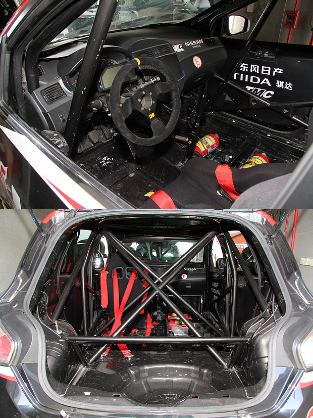 當然,為了維護車手的安全,全車多點式的防滾籠是必要的安全配備,再搭配OMP所生產的方向盤、賽車座椅、安全帶與車窗防護網,以及賽車用滅火器等,建構堅強的座艙環境。同時,為了讓Tiida TMC賽車得以擁有更佳的操駕反應,車內不必要的一切包括乘客座椅與後座、中控台音響與空調系統等皆全數被移除,雖然留下就有的儀表板總成,但所剩下的就只有比賽中所需要的一切,就連原有的類比式儀表版,也為賽車用數位儀表板所覆蓋。而2014年版的賽車,還進一步移除ABS防鎖死煞車,並加大煞車碟盤尺寸,一方面提升賽車的煞車效果,也增加駕馭上的挑戰性。