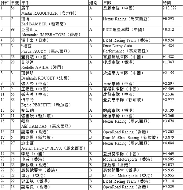 LKM Racing Team的日本車手澤圭太將跟亞歷山大一起從第二排發車。代表Sime Darby Auto Performance的馬來西亞車手福茲(Fairuz Fauzy)將與百威錦龍車隊的中國車手董荷斌從第三排發車。