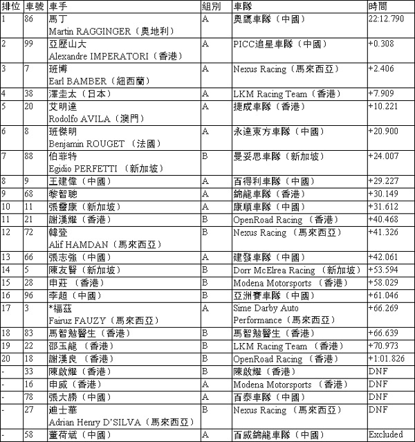 LKM Racing的日本車手澤圭太第四個沖線,緊隨其後的是捷成車隊的艾明達(Rodolfo Avila)。百威錦龍車隊車手董荷斌第六個沖線,隨後因技術違規被取消成績。