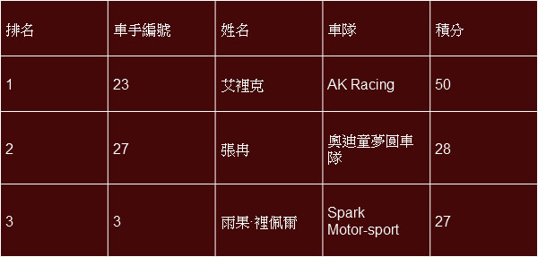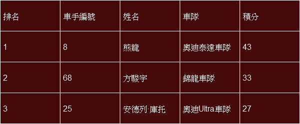 在第二場較量中獲得亞軍的馬來西亞車手熊龍憑藉兩回合優異表現暫居積分榜頭名。安德列·庫托在第二場比賽中一路領先,獲得關鍵性勝利。錦龍車隊車手方駿宇奪得第三。