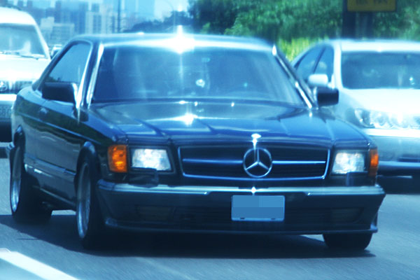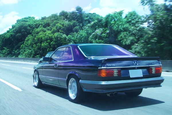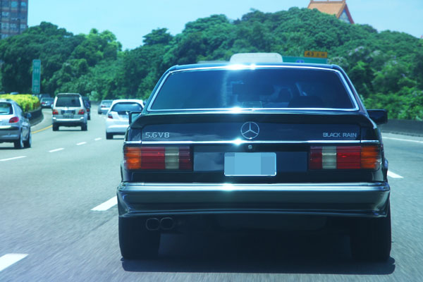 此輛於國道上驚鴻一瞥的560 SEC,可清楚看見車主對其的照顧,除了車漆狀況極佳外,還經過車主自身小幅的改裝,如降低的懸吊、鴨尾尾翼、空力套件、內凹式輪圈與具備雙後出、雙側排的排氣規格〈但不確定兩副排氣系統是不是都有真正的在排氣…〉,且更令筆者注意到的,是車主於車右後方貼上的〝BLACK RAIN〞英文字母,為何要貼上這「黑雨」字樣呢?並非特仕車款,而是此款560 SEC,曾於1989年的〝BLACK RAIN〞電影〈Michael Kirk Douglas主演,也就是麥克道格拉斯…〉中現身,看來車主對於愛車不僅照顧,更是頗有研究。
