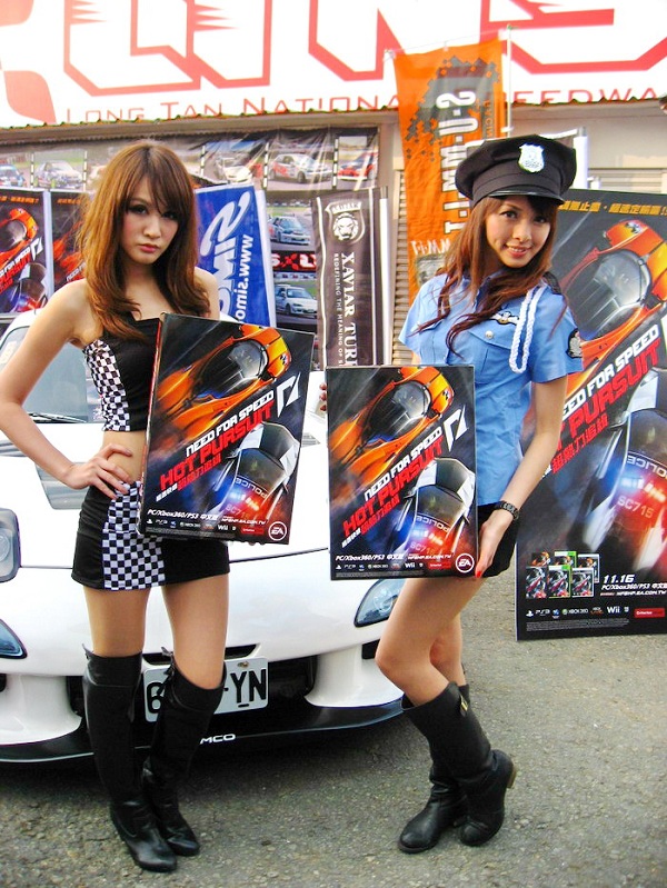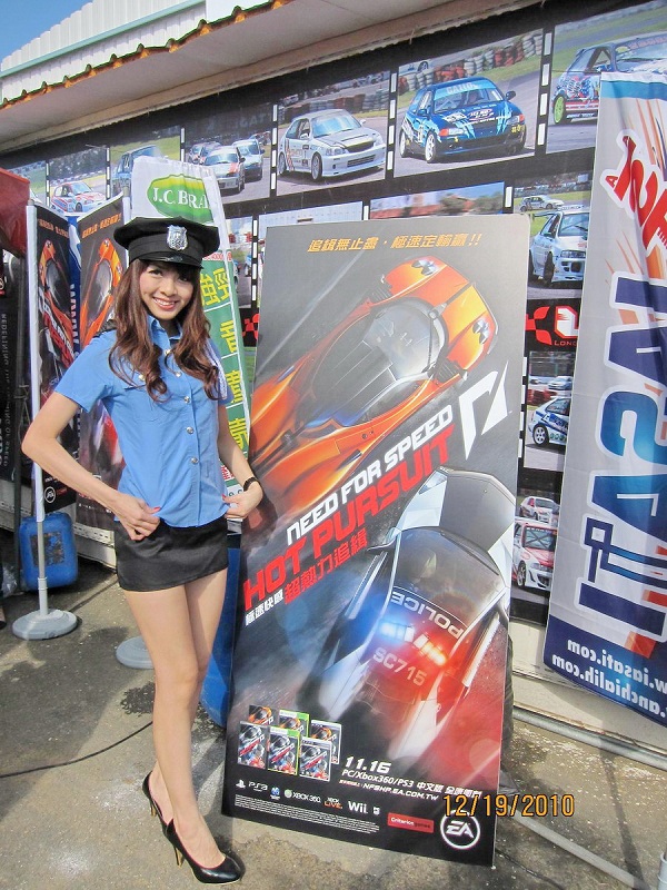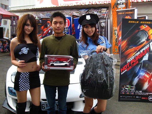 辣手賽車女飛仔加上火爆性感女警靠在跑車上,能夠想像是一種多麼令人血脈噴張的畫面嗎?上週末美商藝電再次參與了龍潭的「Option盃最速街車賽」,舉辦《極速快感 超熱力追緝》體驗活動以及電玩挑戰賽,現場吸引了大批車迷試玩,體驗操控千萬超跑甩尾的爽快滋味,同時也舉行了玩家計時挑戰賽,幸運得到冠軍的參賽者以3:52:24的成績獲得一輛1:18 Pagani Zonda Cinque的酷炫超跑模型。冠軍得主與兩位甜美火辣的Show Girl合照時緊張得都忘記笑了呢! 除了玩家體驗活動,在攤位外更展示了東瀛戰神Nissan GTR(R35) 及Mazda RX-7,讓玩家近距離仔細欣賞。
