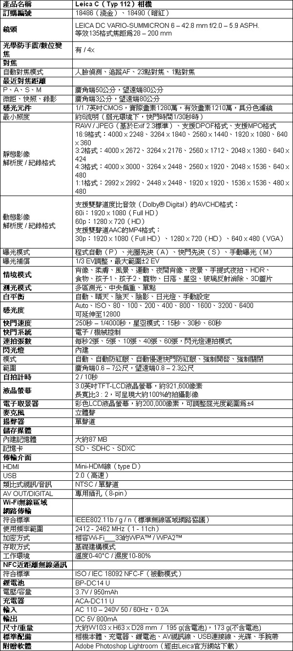 ● 隨相機附贈Adobe Photoshop Lightroom軟體(經由Leica官方網站下載)