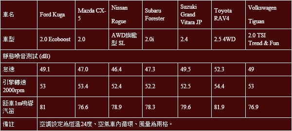 從此次試車組針對怠速、轉速2000rpm與距離車室一公尺位置使用汽笛的測試,可以發現出七輛車的上半部隔音表現其實不分軒輊,沒有太過於明顯的差別,除了RAV4外,對於過往對於Toyota車款總有較佳隔音的市場印象頗有差異,的確是稍微出乎意料的測試結果。