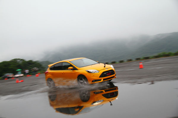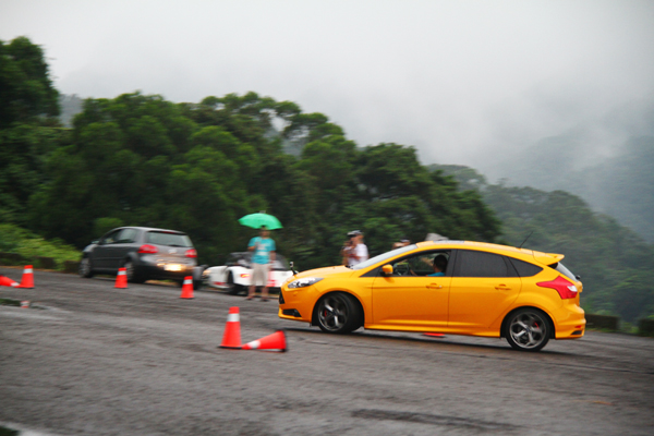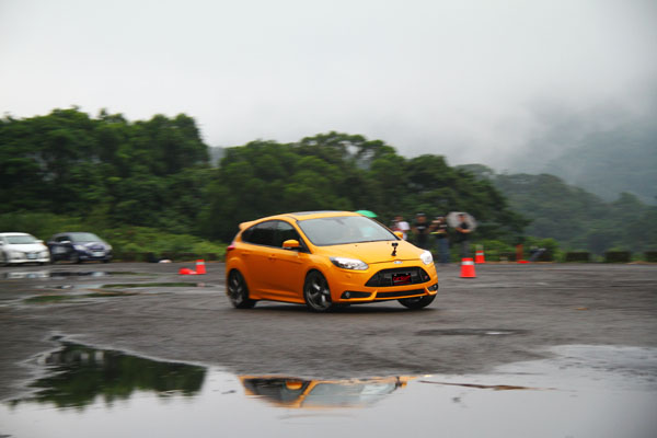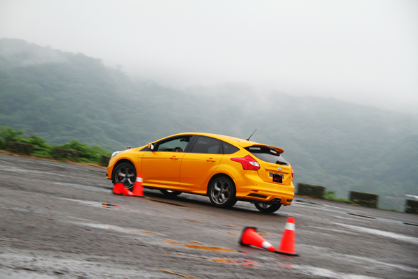 實際下場,Focus ST充沛且全速域的動力輸出,讓它可以在每一次通過彎角時有最好加速反應,即便加速距離很短,但是在這種短促的場地測試中,只要多爭取一點速度就可以讓成績更好;除了優秀的動能表現,此代Focus ST為提升整體操控性能,大幅減少了方向盤左右死點迴轉的圈數,僅僅1.8圈,此優勢馬上反應在本次的測試中,讓駕駛可以不用手忙腳亂的轉動方向盤,不過,Focus ST車身尺碼為本次所有車款中第二長的,因此也略微影響了整體靈活性,由其在前兩個錐筒間的8字型迴轉會稍嫌吃力些,經過一番測試,最佳的成績為33.7秒,但每一位編輯間的秒差也較明顯,撇開其中一位編輯為駕駛手排車的生手,其他三位編輯的秒數成績各差了約一秒,可見不同風格的駕駛者,對於Focus ST的適應性差別較為明顯,在過程中,為了加快後軸跟進的速度,我們各自都利用拉手煞車來控制後軸側滑角度,幫助車輛帶入轉角中,此時,每個人控制轉向角度與手煞車力道的能力立即反應於成績上,若是對它的調性適應越慢,成績也就跟著較慢。