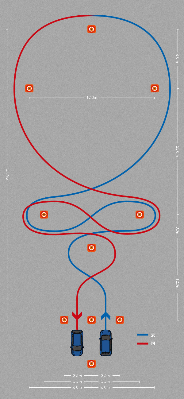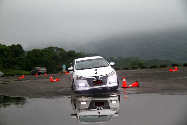 在時間與場地的限制下,同時在以考量測試安全,我們以錐筒簡單排出金卡納關卡,做為本次試駕的操控試驗場,而且我們刻意縮短了錐筒間的距離,以空出更多的兩側緩衝空間,強迫駕駛者必須將轉向半徑縮小,避免過於偏離路線,因此,油門控制也必須更為精細,以保持最佳的平均速度,讓車輛迅速通過每一個障礙點,同時也因為車輛必須快速轉向,也考驗著車輛轉向系統設定反應,是否能通過此試煉。