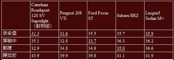 此外,在測試部分,由編輯部每位成員皆各自駕駛每一款車,各計時一次,由於每個人僅有一次機會,所以也考驗著每個人是否能在最短時間內適應每輛車的特性,反之,也反應出每輛車是否能夠讓每個人在最短時間內上手,讓每一位駕駛者可以在短時間內感受駕馭它的樂趣。而且為安全考量,所有測試過程都未將任何電子輔助系統關閉,維持車輛最基本的設定進行測試。