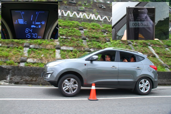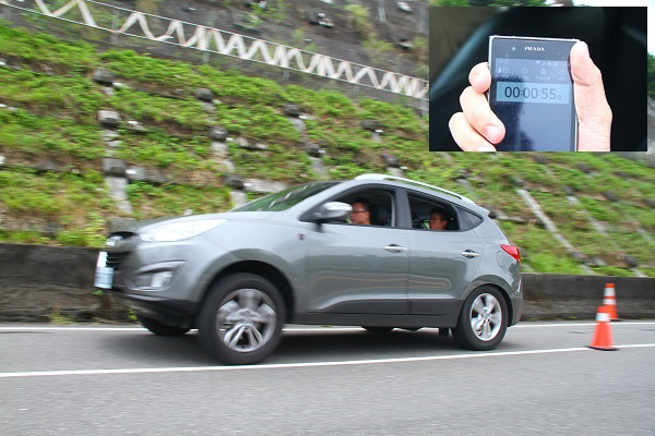 自排模式下ix35獲得55.0秒好成績,主因在於豐沛的扭力、四驅以及成熟的底盤設定,從照片裡車身的抬頭程度便可知道加速力道有多強。
